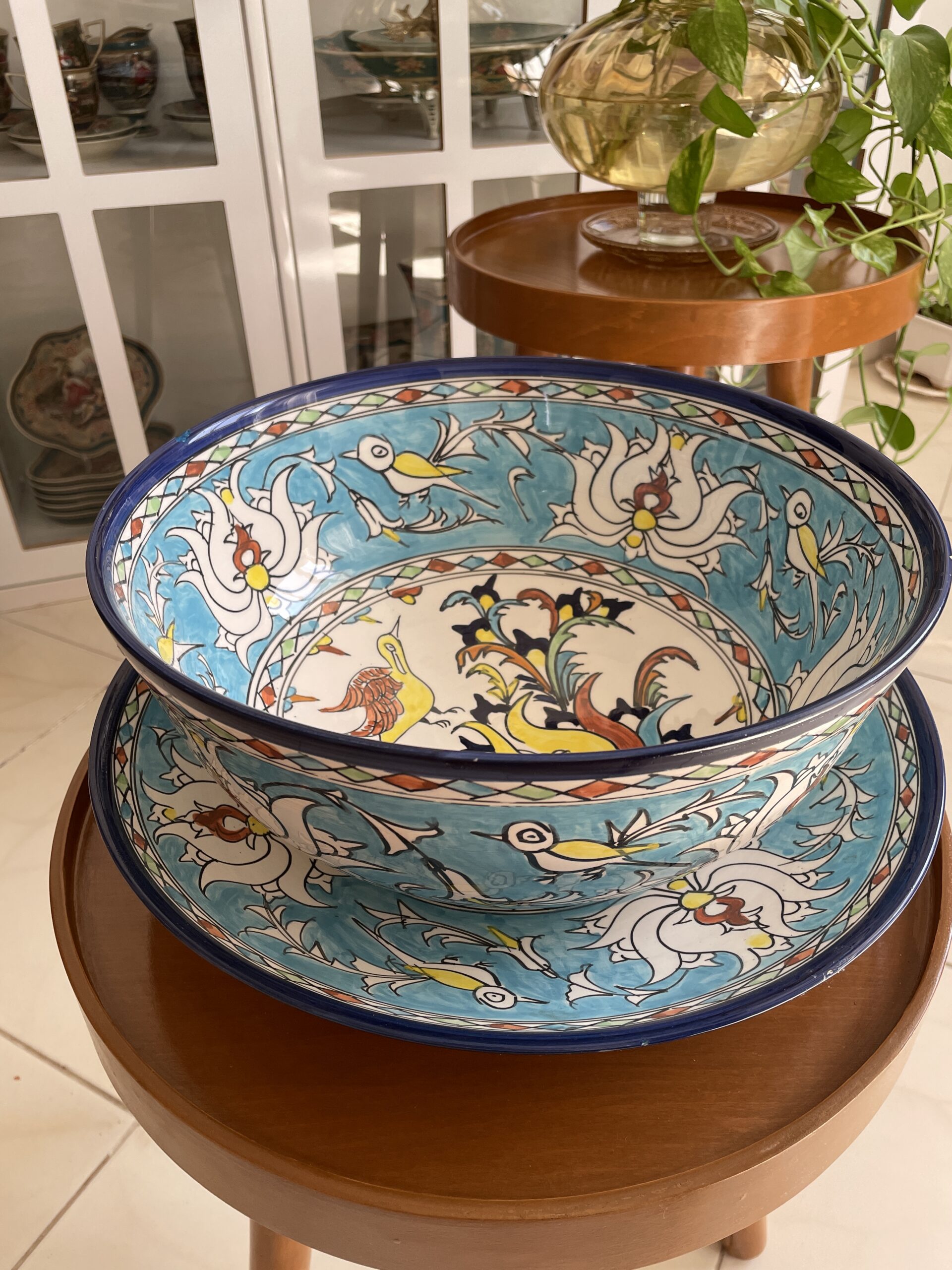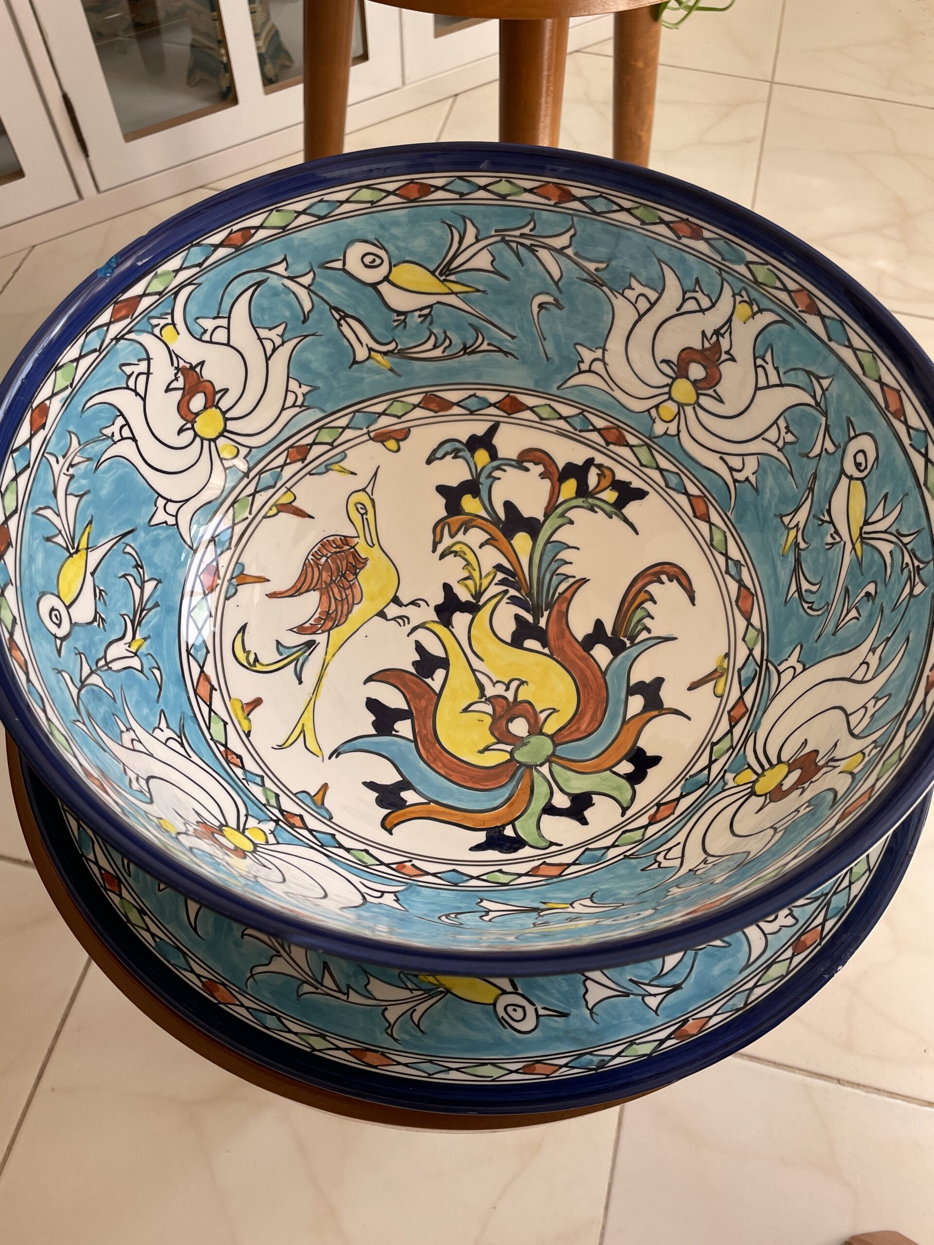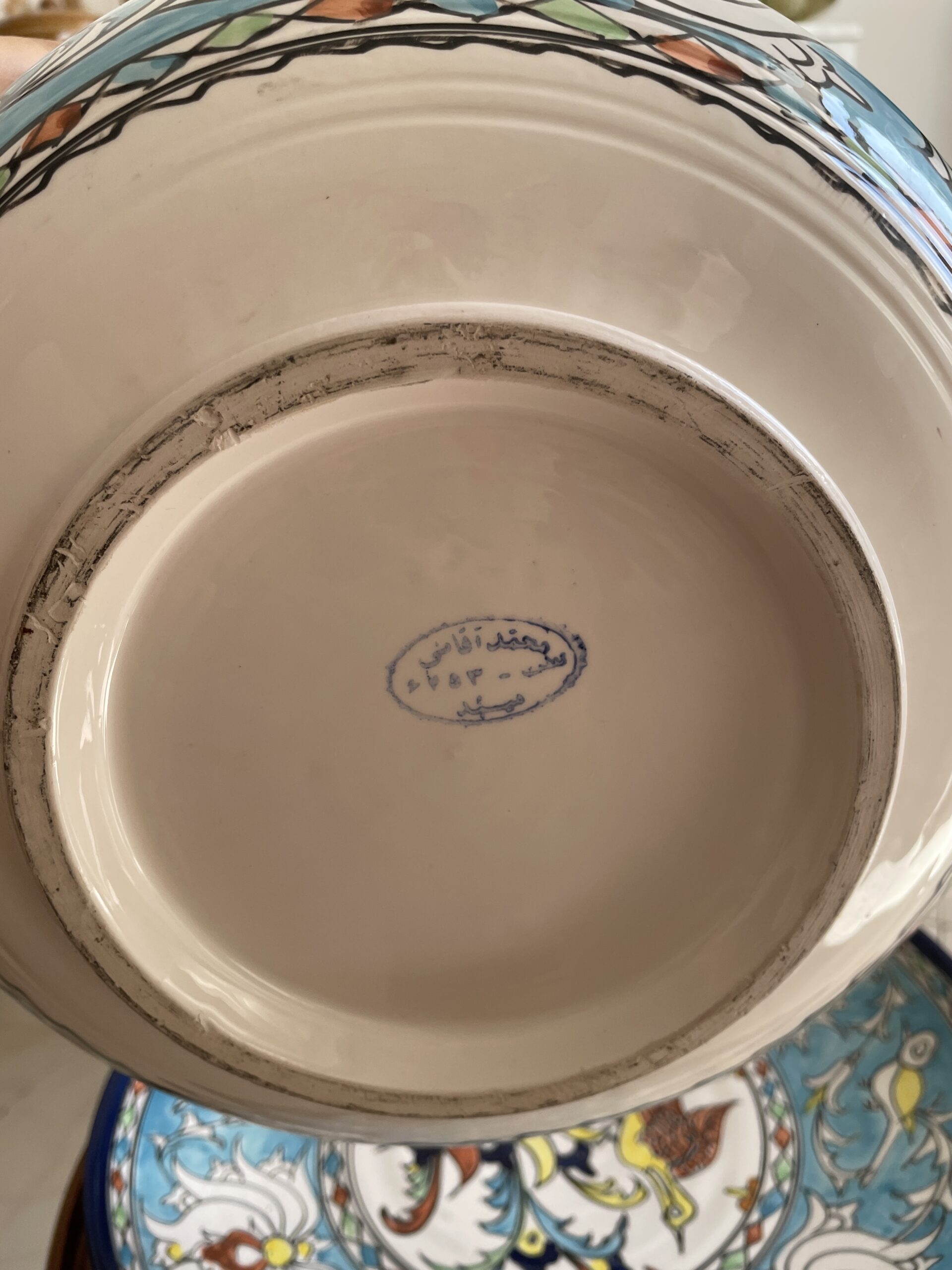 قاب و قدح نقاشی شده کار دست بسیار بسیار قدیمی و مهر دار اب نزده (لب پری جزعی) بزرگترین سایز قاب و قدح انتیک